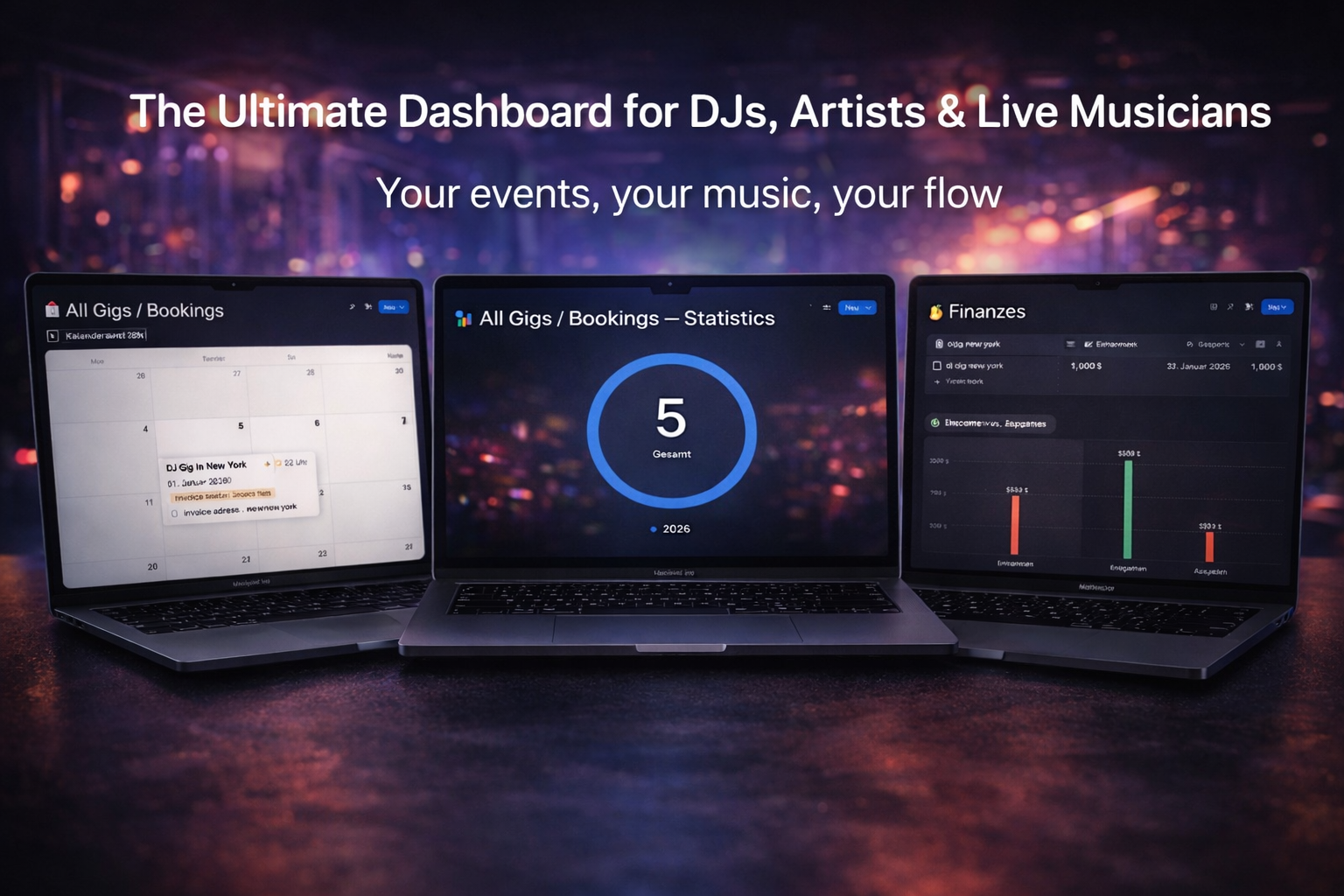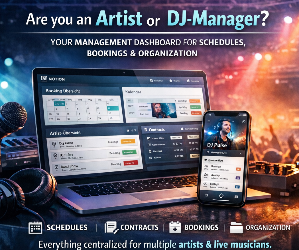 Manage all your gigs, bookings, performance rights reporting, and finances in one place. This Notion template was specifically designed for professional DJs and live musicians – with calendar, financial tracking, and social media planning.